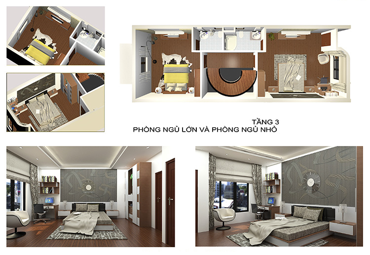 Dù diện tích không quá lớn nhưng với sự sắp xếp tinh tế, căn phòng ngủ trong nhà vẫn trông rất rộng rãi với tủ quần áo âm tường, nhà vệ sinh, bàn trang điểm, màn hình tivi và một chiếc bàn nhỏ kê bên dưới. Tất cả được bày trí hợp lý với không gian nhỏ, phục vụ nhu cầu sinh hoạt trong phòng một cách hiệu quả nhất.
