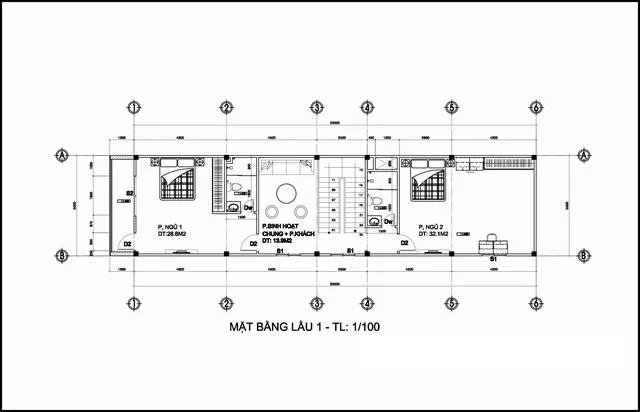 Bản vẽ thiết kế công năng mẫu thiết kế nhà phố 2 tầng 1 tum 5x20m kinh doanh Mẫu thiết kế nhà phố 2 tầng nằm trong khu đất liền kề đang cần giải tỏa để làm đường lớn; Nên giải pháp xây nhà là móng cao 75cm đến 1m; Lỡ sau này có làm đường mới dù nâng lên thì vẫn cao ráo thông thoáng. Bản vẽ mẫu nhà này phía sau còn khoảng đất trống hơn 1m giáp với dãy nhà trọ cấp 4; Và có lối vào ở cửa sau. Nên không gian thiết kế chia thành 2 không gian chính. Phía sau thiết kế 1 bếp và khách cho chủ nhà sinh hoạt riêng có cửa khóa trái. Phía sau không liên quan đến phần cho thuê mặt bằng phía ngoài. Tương lai gần vài năm sau khi không cho thuê có thể cải tạo thành 1 phòng ngủ trệt được. Tiện lợi là không phải đập bỏ hay phá vỡ kết cấu. Mẫu thiết kế nhà phố Diện tích tầng trệt có phòng kinh doanh thiết kế rộng 42 m2. Phòng khách phía sau cầu thang đi vào rộng hơn 20 m2 và bếp ăn rộng 19,6m2 có chỗ để xe máy. Còn lại cầu thang thiết kế rộng 2.2m chân cầu thang có vệ sinh và bồn rửa. Khác biệt nữa chính là không gian kinh doanh cạnh cầu thang trước mắt. Vách ngăn nhôm kính ngay phía ngoài đi vào để che cầu thang; Nhưng khi khách thuê có thể ra sau vệ sinh được. Bản vẽ không gian tầng lầu 1 nhà ống 2 tầng 1 tum 5x20m Không gian mẫu thiết kế nhà phố hiện đại 2 tầng 1 tum có diện tích sàn xây dựng hơn 110m2. Phía ngoài có thêm ban công lan can kính cường lực 10 ly khung thép. Tiện ích bên trong thiết kế có 1 phòng ngủ master phía sau rộng hơn 32 m2; Có phòng tập Gym và bàn làm việc, phòng thay đồ đầy đủ. Phòng sinh hoạt chung bố trí thiết kế cạnh cầu thang lối lên từ tầng trệt diện tích rộng gần 14m2. Có thể tiếp khách riêng tại đây hay thư giãn chuyện trò.